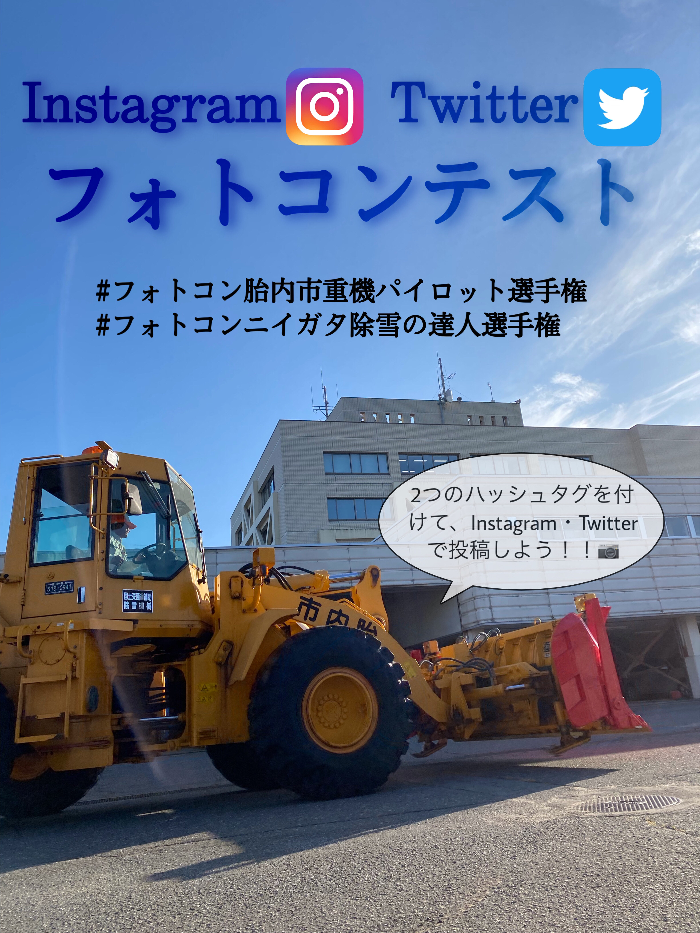 投稿が公開設定されているInstagram若しくはTwitterにて「#フォトコン胎内市重機パイロット選手権」「#フォトコンニイガタ除雪の達人」二つのタグを併記してPOSTしてください。同じ作品を両方に投稿された際は、一つの作品として審査表彰いたします。